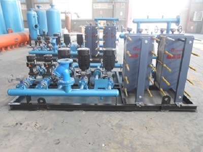 汽水换热机组整体式换热机组既可用于水?水交换,也可用于汽?水交换,并可加装自动定压补水装置、水处理设备、水箱、水泵变频控制、温控阀、远程通讯控制等,从而构成一个完整的热交换站。该机组具有标准化、模块化的设计、配置齐全,安装方便、高效节能,已广泛应用于小区集中供热、中央空调、生活用水、企业生产工艺用水等系统中。
